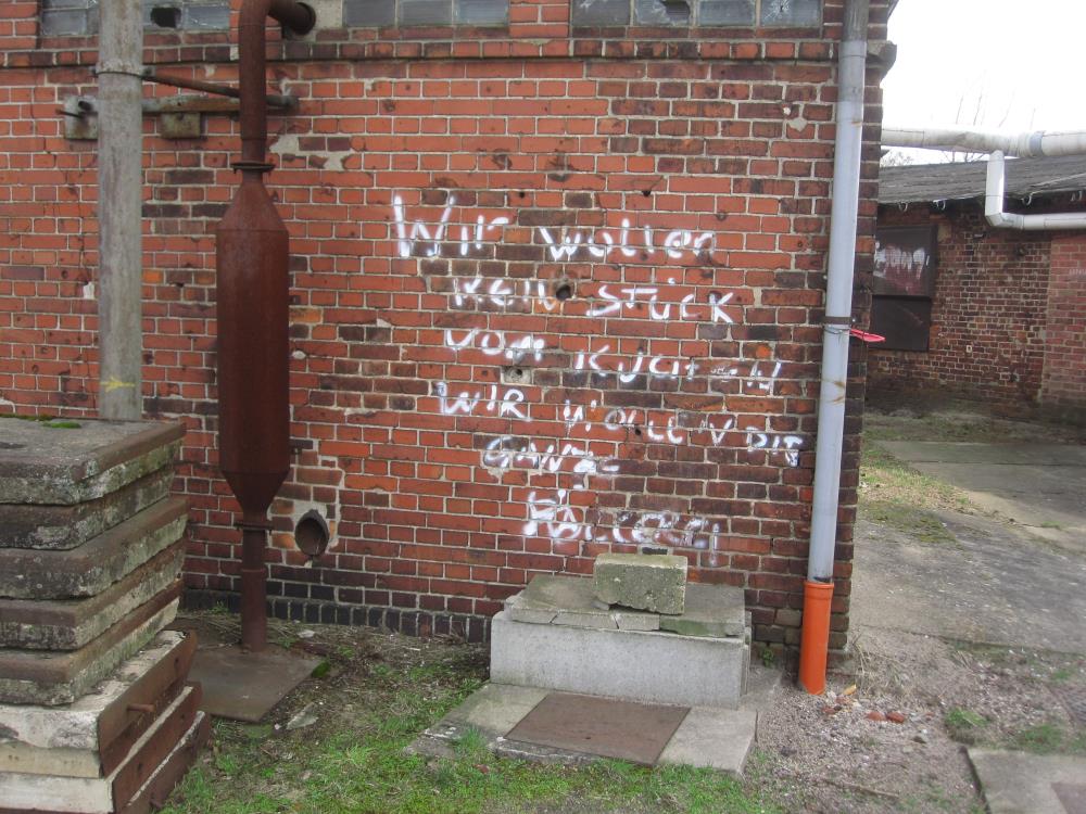 Neben dem Auspuff des o.g. Notstromdiesels befindet sich ein Stück Zeitgeschichte aus der jüngeren Vergangenheit. Auf dem hier angebrachten Graffiti erkennt man den Frust der Nachwendezeit. Vielleicht hat auch der Ärger über die Schließung des Bahnbetriebswerks im Jahre 2006 den „Künstler“ zu seinem Werk motiviert.