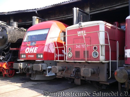 Anlässlich der Hansetage war am 08.06.2008 war die Diesellok OHE 270081 im Lokschuppen zu Gast. Die nachfolgenden Bilder zeigen die Lok auf der Drehscheibe und einige Aufnahmen des Innenlebens.