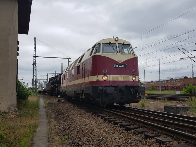 Nach längerer Abstellzeit durfte auch die Diesellok 118 748 mal wieder zeigen, dass sie noch nicht zu alten Eisen gehört. Der neue Eigentümer der Lok hatte zugestimmt und ein Eisenbahnsachverständiger zuvor den ordnungsgemäßen Zustand der Maschine attestiert. Also wurde sie für die Paraden in Betrieb gesetzt.