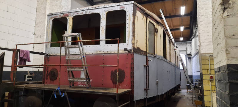 Wie schon vor kurzem berichtet, laufen nun die Arbeiten an dem Beiwagen 190 851 auf Hochtouren. Inzwischen konnten die Stellen, an denen der Rost die Außenhaut angegriffen hat, mit Rostumwandler behandelt werden. Dieser stoppt die weitere Oxydation des Metalls. Nachdem die chemische Reaktion abgeschlossen war, konnten weite Teile der Außenhaut des Wagens grundiert werden. Inzwischen sind die Seitenwände und das Dach gesäubert und mit Rostschutz versehen.