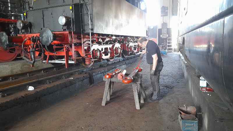 Außerdem wurden die Kuppeleisen gesäubert, auf Risse untersucht und neu lackiert. Sie sind jetzt bereit zum Wiedereinbau zwischen Lok und Tender.