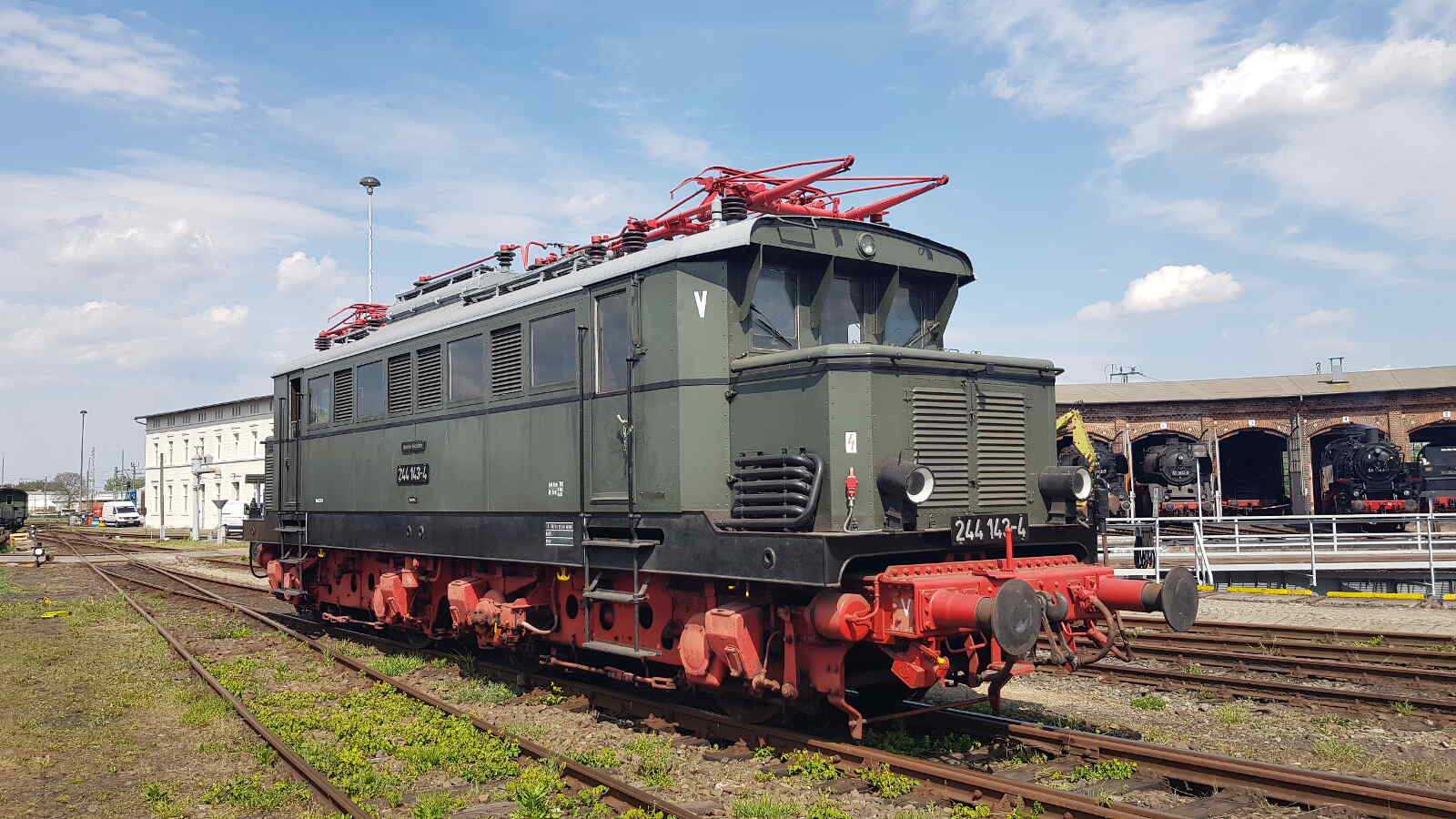 Wir hatten auch einiges zu bieten. So standen die 86 1744 der Press-Gruppe und unsere Dampflok Emma abwechselnd für Führerstandsmitfahrten zur Verfügung. Außerdem gab es wieder die beliebten Rundfahrten durchs Gelände mit unserem kleinen Museumszug, der von der Drehscheibe bis zur südlichen Grundstücksgrenze verkehrte, dort die Fahrtrichtung wechselt und zum Hauptbahnhof fuhr. Von dort aus nahm der die Gleisverbindung am Lokschuppen der Eisenbahngesellschaft Potsdam vorbei zurück zur Drehscheibe.