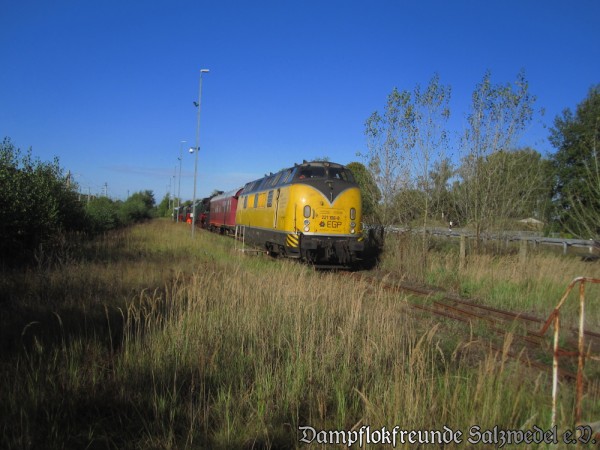 Eine Lok der Baureihe 221 vor einem Fahrzeugzug des Vereins kurz vor der Abfahrt in Salzwedel am 13.10.2012