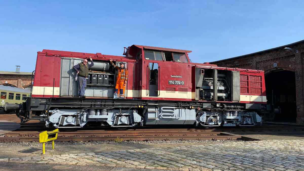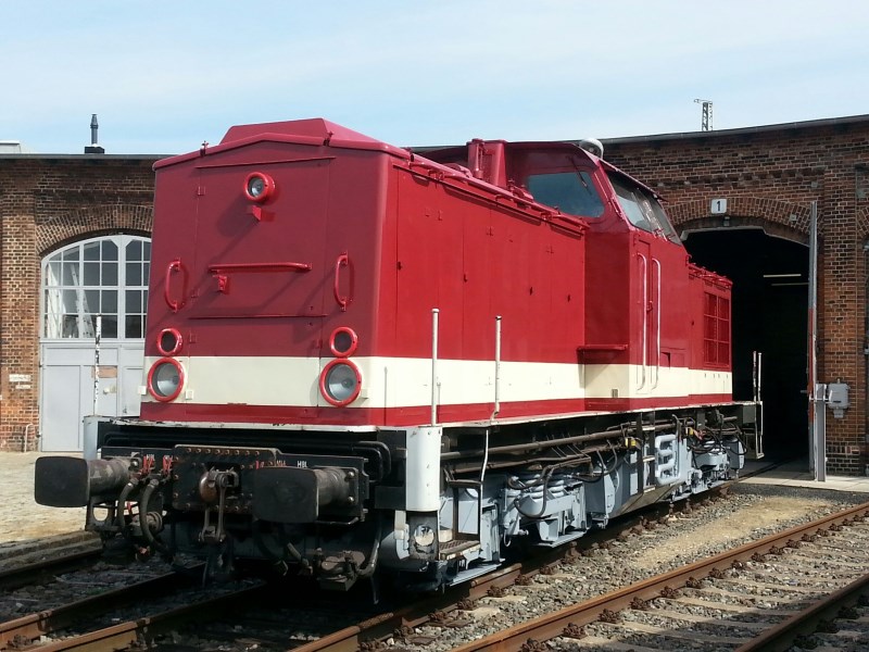 Am Samstag, den 11.4.2015, nutzten die Aktiven und Besucher des Museums das schöne Wetter, um die Diesellok 204 774-4 (Baureihe V 100 der Deutschen Reichsbahn) im Sonnenschein zu begutachten. Unser Vereinskollege Björn Strähle hatte die Lok in mühevoller Handarbeit angeschliffen, grundiert und schließlich mit Hochglanzlack neu lackiert. Danke dafür nochmal! Das Bild zeigt den derzeitigen Zustand. Bis zum 1. Lokschuppenfest am 09./10.05.2015 werden noch die Handstangen und Pufferträger schwarz und die Lampenringe silbern lackiert. Selbstverständlich werden auch noch die neuen Nummernschilder mit der Beschriftung 114 774-3 angebracht. Dann präsentieren wir die Lok in der letzten Lackierung und Beschriftung der Deutschen Reichsbahn.