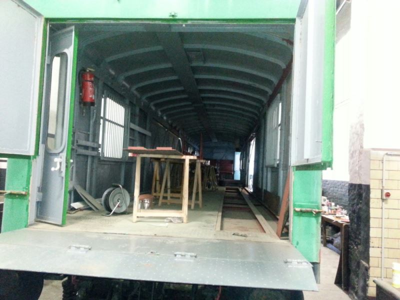 Nachdem nun der Hallenstand frei wurde, werden wir uns des Autotransportwagens aus dem Regierungszug von Walter Ulbricht annehmen. Dabei handelte es sich ursprünglich um einen vierachsigen Packwagen, der 1961 als Transporter für maximal zwei Kfz umgestaltet wurde. Dafür erhielt er größere Seitenschiebetüren und die Stirnwände wurden als Einfahrtstore ausgelegt. Außerdem wurde das Fahrzeug im Bereich des Wagenbodens verstärkt, denn auch die damaligen Staatskarossen hatten bereits ein hohes Gewicht. Wenn Sie, liebe Leser, durch Zufall zu diesem Fahrzeug noch Bilder oder sonstige Dokumentation haben, würden wir uns über Kopien sehr freuen.