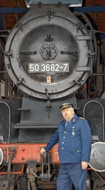 Stadtführer Jürgen Schmidt vor der Dampflok von 1939, die ebenfalls zum Vereinsbestand gehört. Neben den Veranstaltungen, die die Dampflokfreunde anbieten, gibt es auch spezielle Angebote des Kultur- und Tourismusbetriebes. Schmidt führt als Eisenbahner ins Depot. |