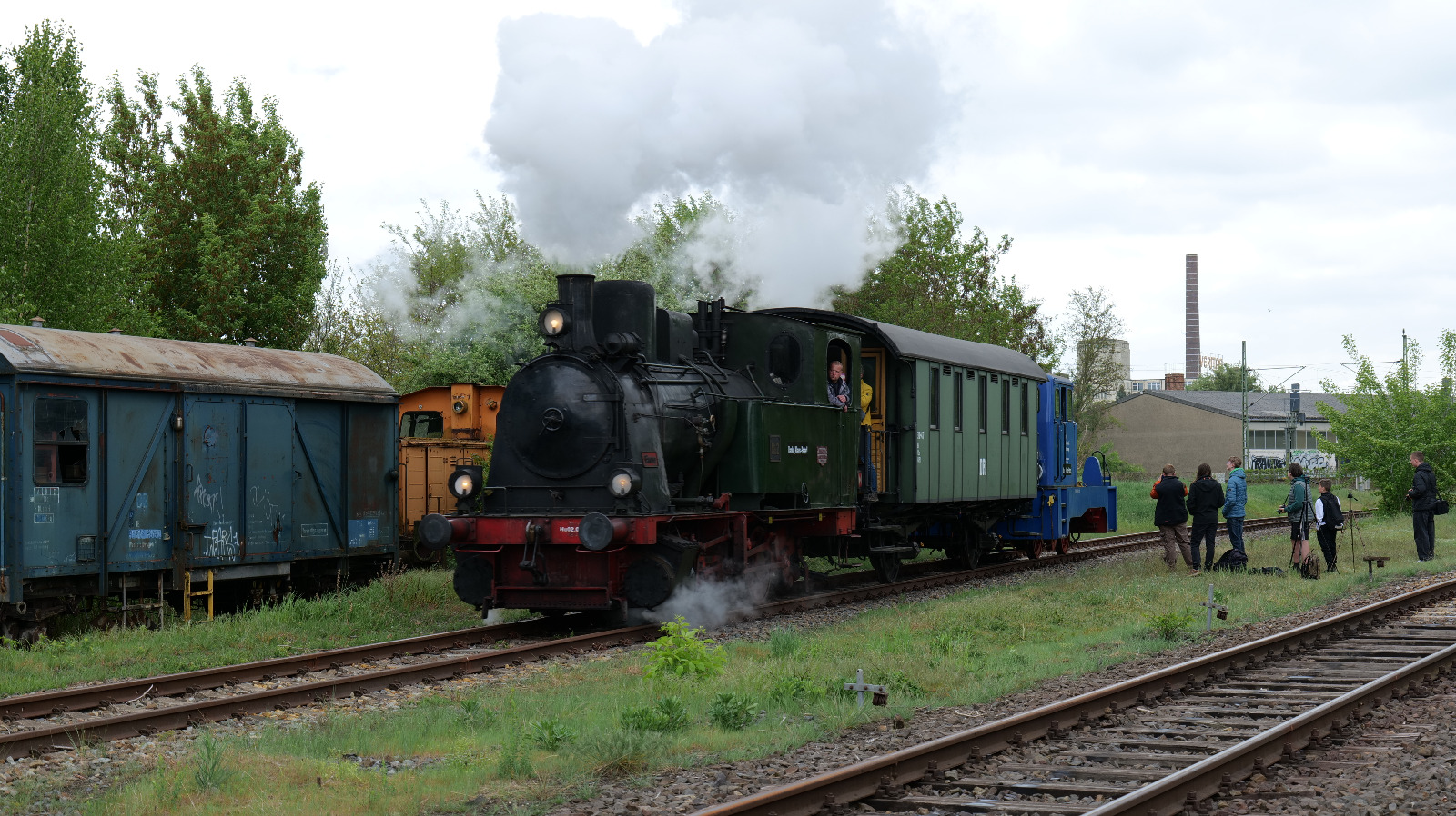 Wir hatten auch einiges zu bieten. So standen die 86 1744 der Press-Gruppe und unsere Dampflok Emma abwechselnd für Führerstandsmitfahrten zur Verfügung. Außerdem gab es wieder die beliebten Rundfahrten durchs Gelände mit unserem kleinen Museumszug, der von der Drehscheibe bis zur südlichen Grundstücksgrenze verkehrte, dort die Fahrtrichtung wechselt und zum Hauptbahnhof fuhr. Von dort aus nahm der die Gleisverbindung am Lokschuppen der Eisenbahngesellschaft Potsdam vorbei zurück zur Drehscheibe.