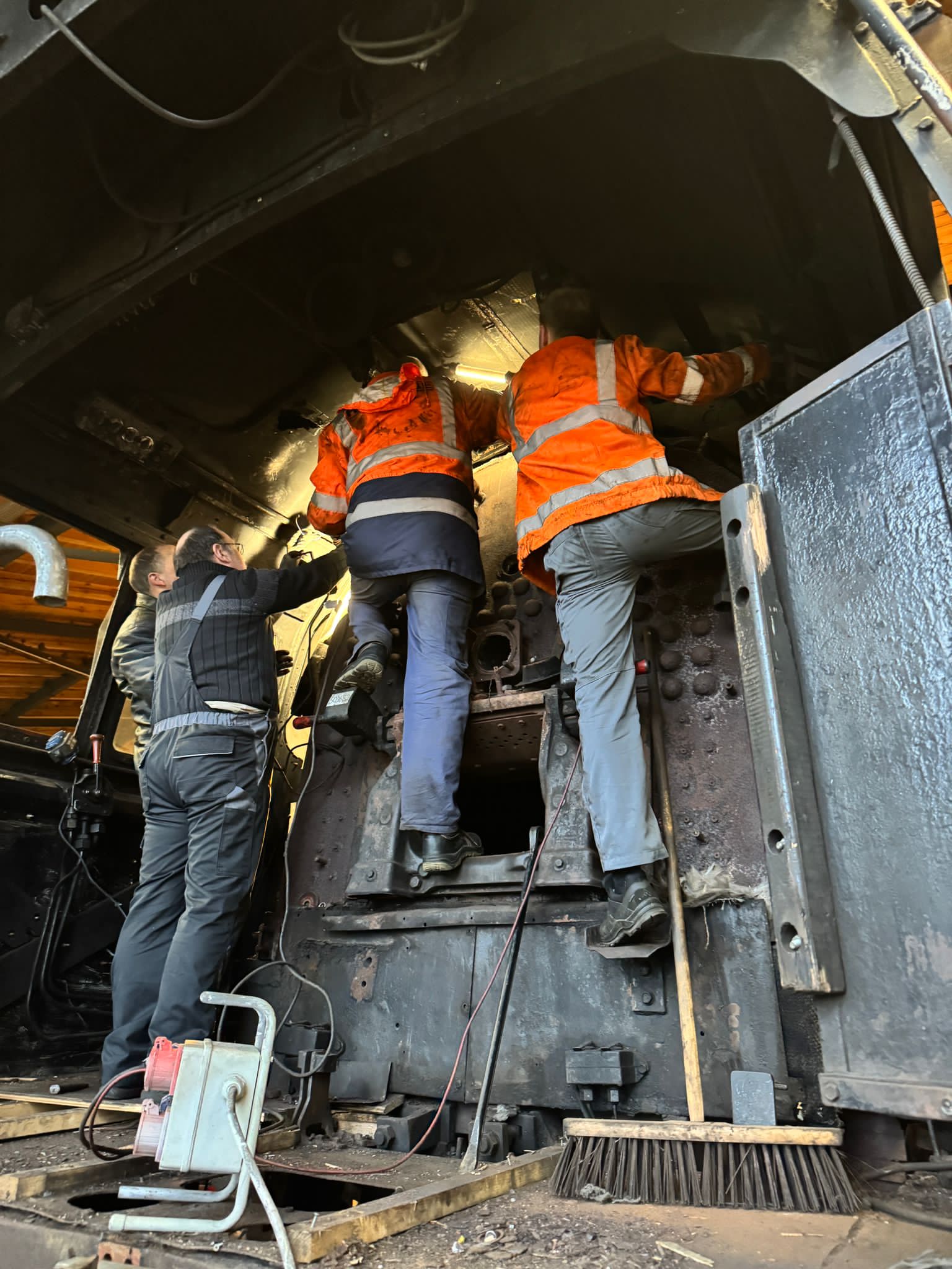 Arbeiten an unserer Dampflok 50 3682 am 3.4.2026. Das Führerhaus wird entfernt, um demnächst den Kessel der Lok abheben zu können.