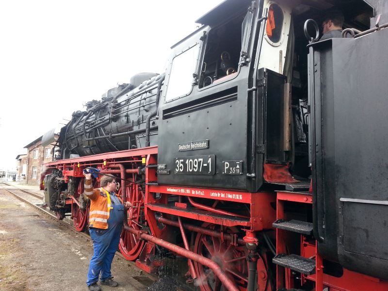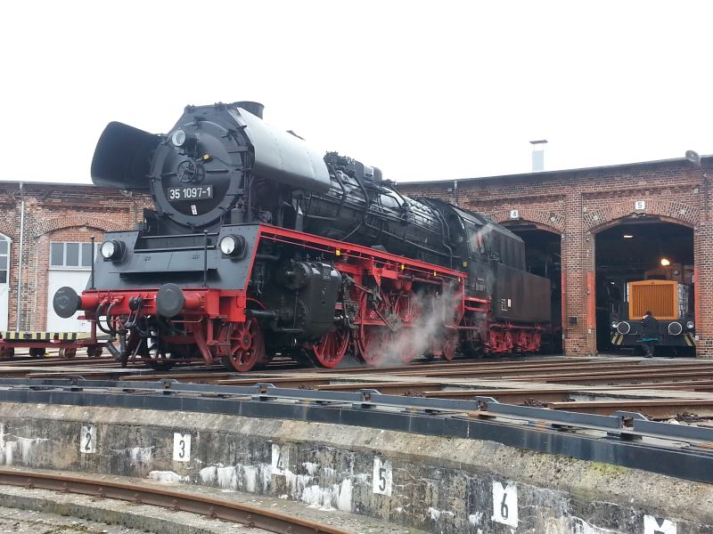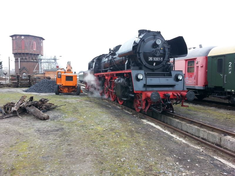In den vergangenen Tagen haben zwei Dampflokomotiven Halt in Wittenberge gemacht, um Kohle und Wasser nachzubunkern und um einige Tage einige historische Reisezugwagen abzustellen, die zwischen zwei Sonderfahrten nicht gebraucht wurden. Am Montag, den 25.2. erschien die Dampflok 03 2155 der Firma WFL auf dem Gelände des Historischen Lokschuppens, ergänzte ihre Wasservorräte und verließ nach rund drei Stunden wieder den Hof, um weiter Richtung Berlin zu dampfen. Dabei ließ sie drei Reisezugwagen der Gattung Bghw hier stehen, die am 2.3. für eine Fahrt von Hamburg nach Wernigerode gebraucht wurden. Diese Wagen wurden am 1.3. von 35 1097 unserer Kollegen aus Glauchau abgeholt, die ihren Leerreisezug nach Hamburg gemeinsam mit der Diesellok 118 770 bespannte.